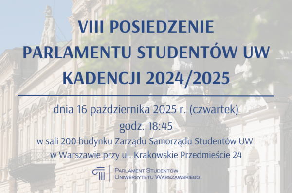 Postanowieniem nr 25/2024/2025 Marszałka Parlamentu Studentów UW z dnia 9 października 2025 r. zwołano VIII posiedzenie Parlamentu Studentów Uniwersytetu Warszawskiego kadencji 2024/2025. Posiedzenie rozpocznie się dnia 16 października 2025 r. ...