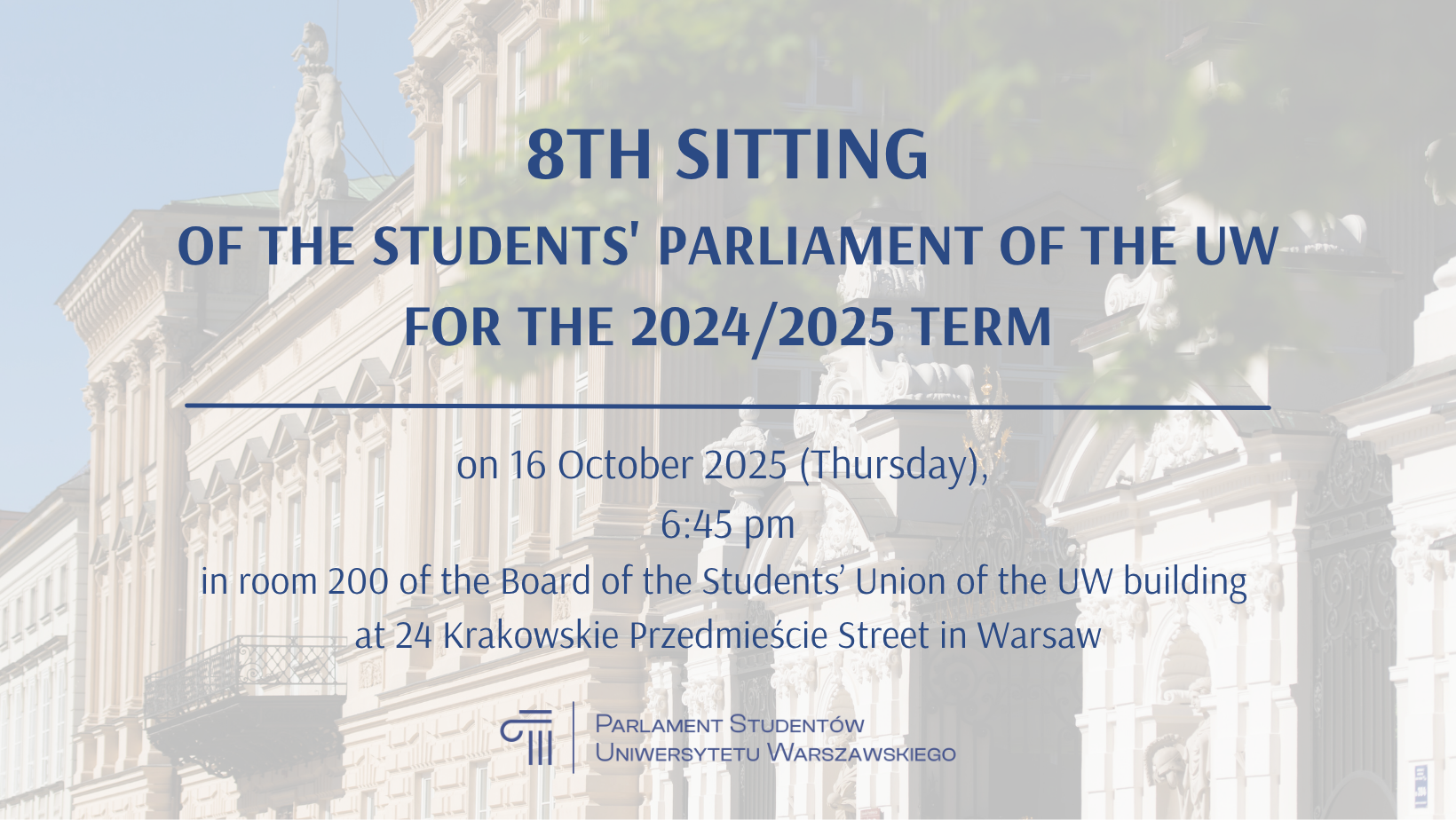 The sitting will begin on October 16,2025 (Thursday) at 6:45 pm. It will be held in room 200 of the Board of the Students’ Union of the University of Warsaw building at 24 Krakowskie Przedmieście Street in Warsaw. The sitting will be held in Polish.