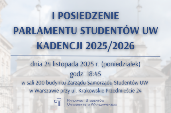 Informujemy, że postanowieniem nr 1/2024/2025 Przewodniczącego Komisji Rewizyjnej Samorządu Studentów UW z dnia 17 listopada 2025 roku zwołano I posiedzenie Parlamentu Studentów Uniwersytetu Warszawskiego kadencji 2025/2026. Posiedzenie rozpocznie się dnia 24 ...
